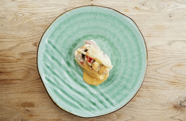 - Haal de vis uit de papillot en dresseer op een bord samen met de garnituur. Werk af met de sabayon en nog wat extra piment d‘Espelette of paprikapoeder.
