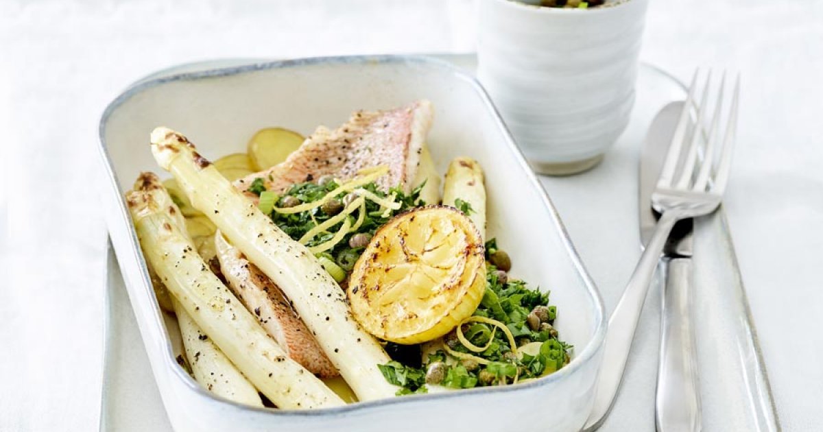 Aardappelen met witte asperges en roodbaars uit de oven